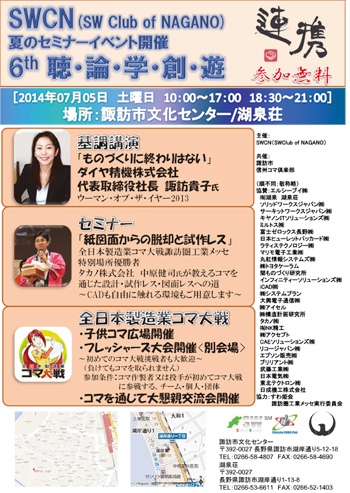 会社の枠を超えた異業種交流会「SWCN」が、諏訪市文化センター及び湖泉荘にて、第6回夏イベント「聴・論・学・創・遊」を開催いたします。
